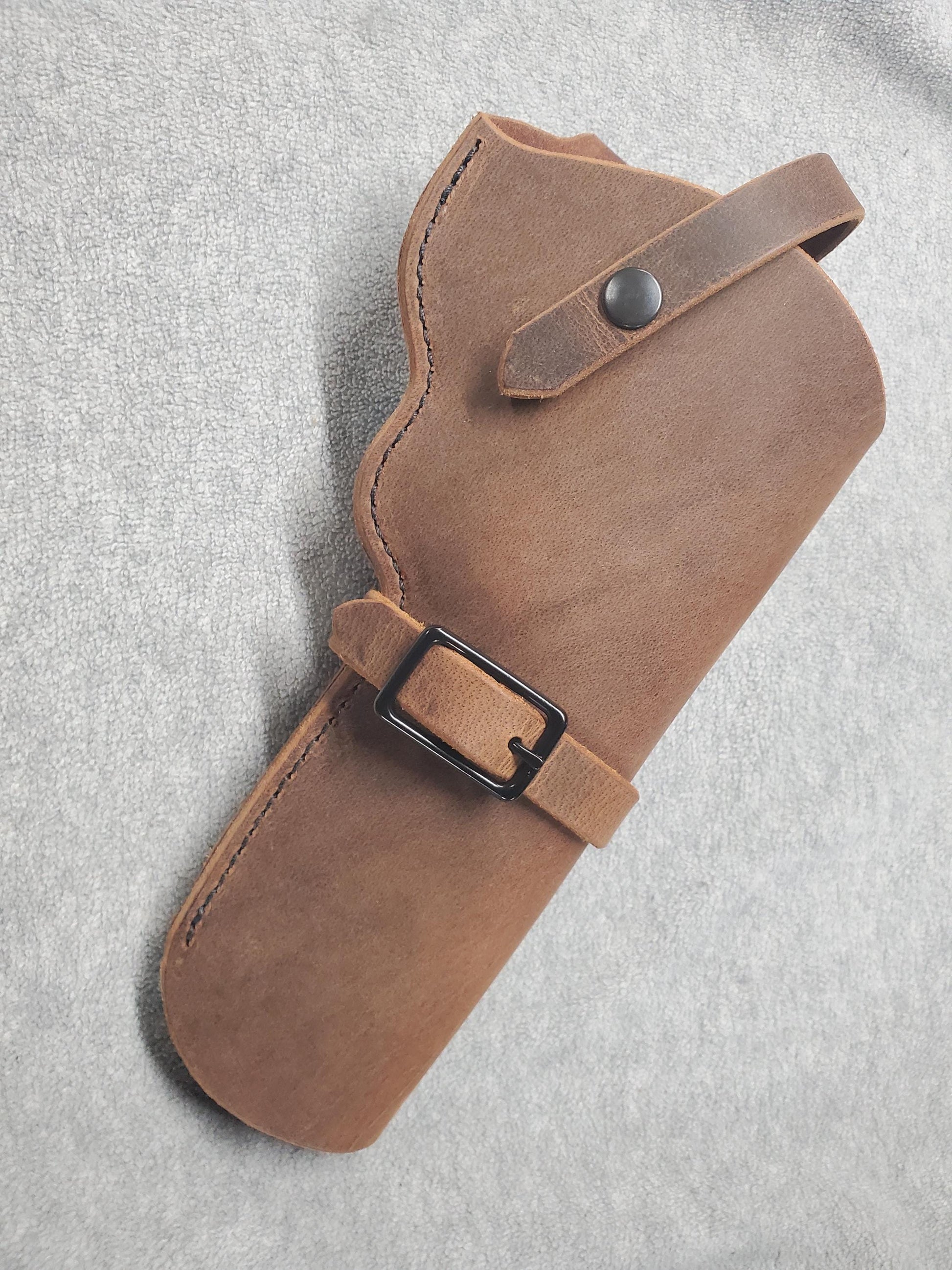 Leather holster made from crazy horse leather. Has holding strap with snap and barrel strap with buckle. Stitched with heavy duty thread that will withstand years of use.