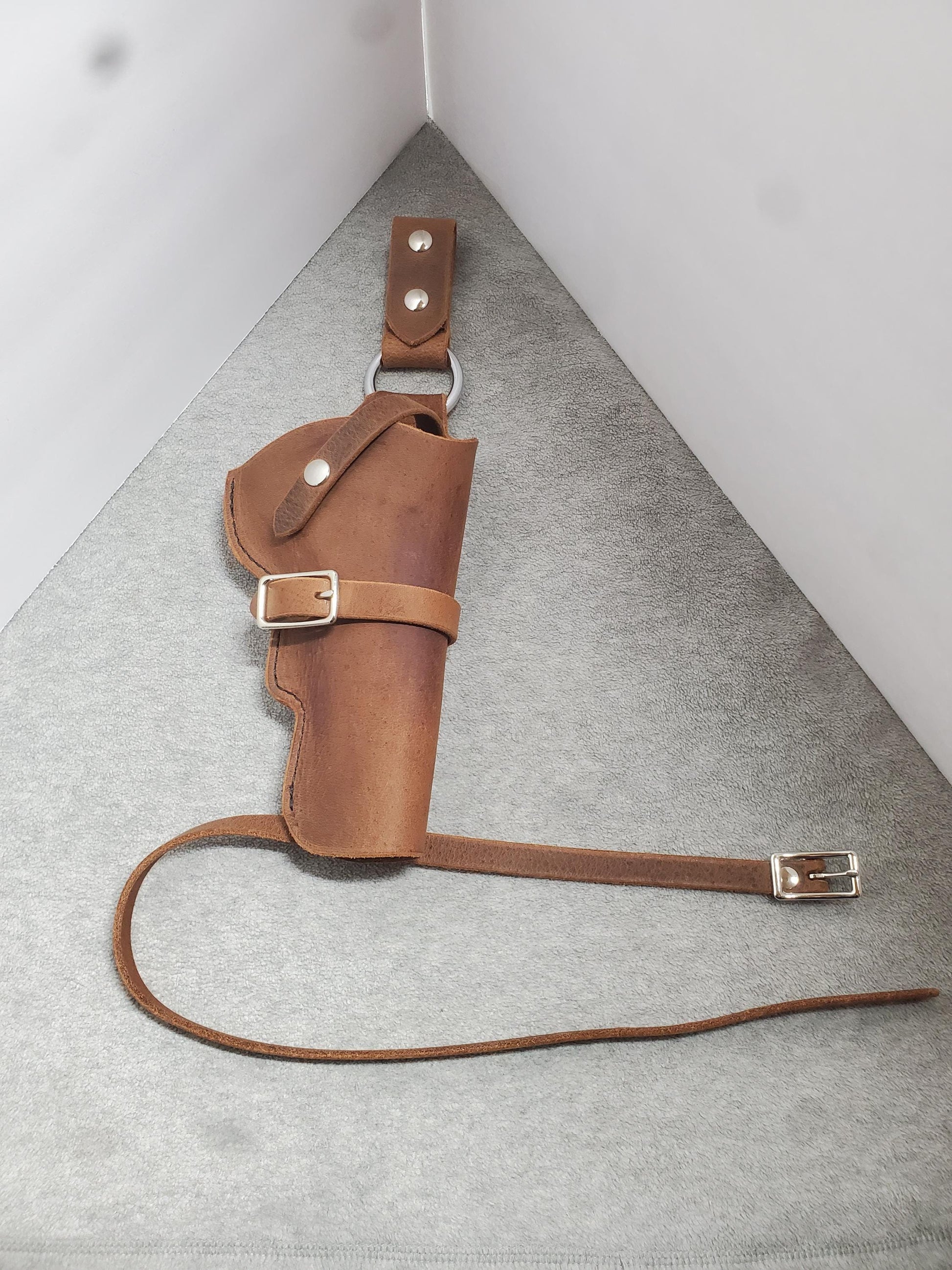 This drop-holster is made from heavy-duty crazy horse leather and has a leg-strap, snap strap and buckle strap around barrel or cylinder. The drop-design puts your gun in a more convenient position for drawing, and the leg strap holds the holster in place while removing the revolver! The strap going around your belt is held firmly in place with 2 snaps, and allows for easy removal. Fits up to 2" belts.