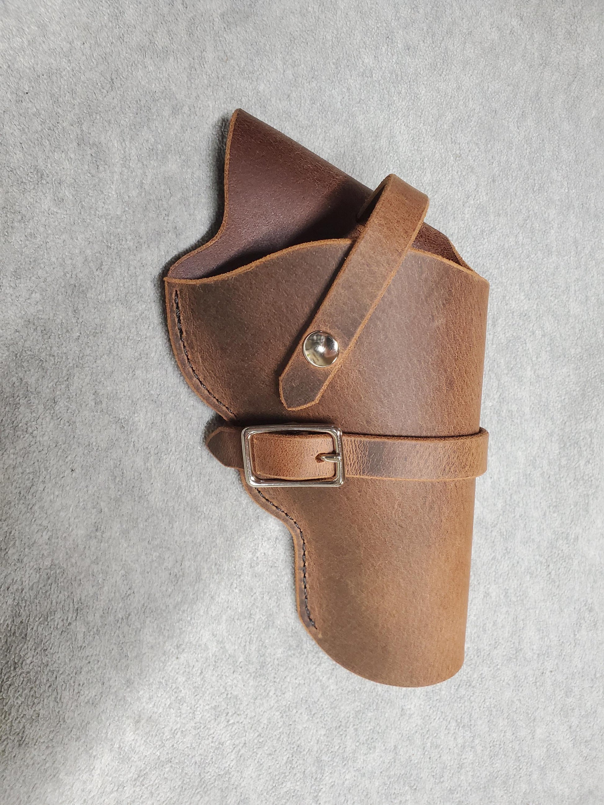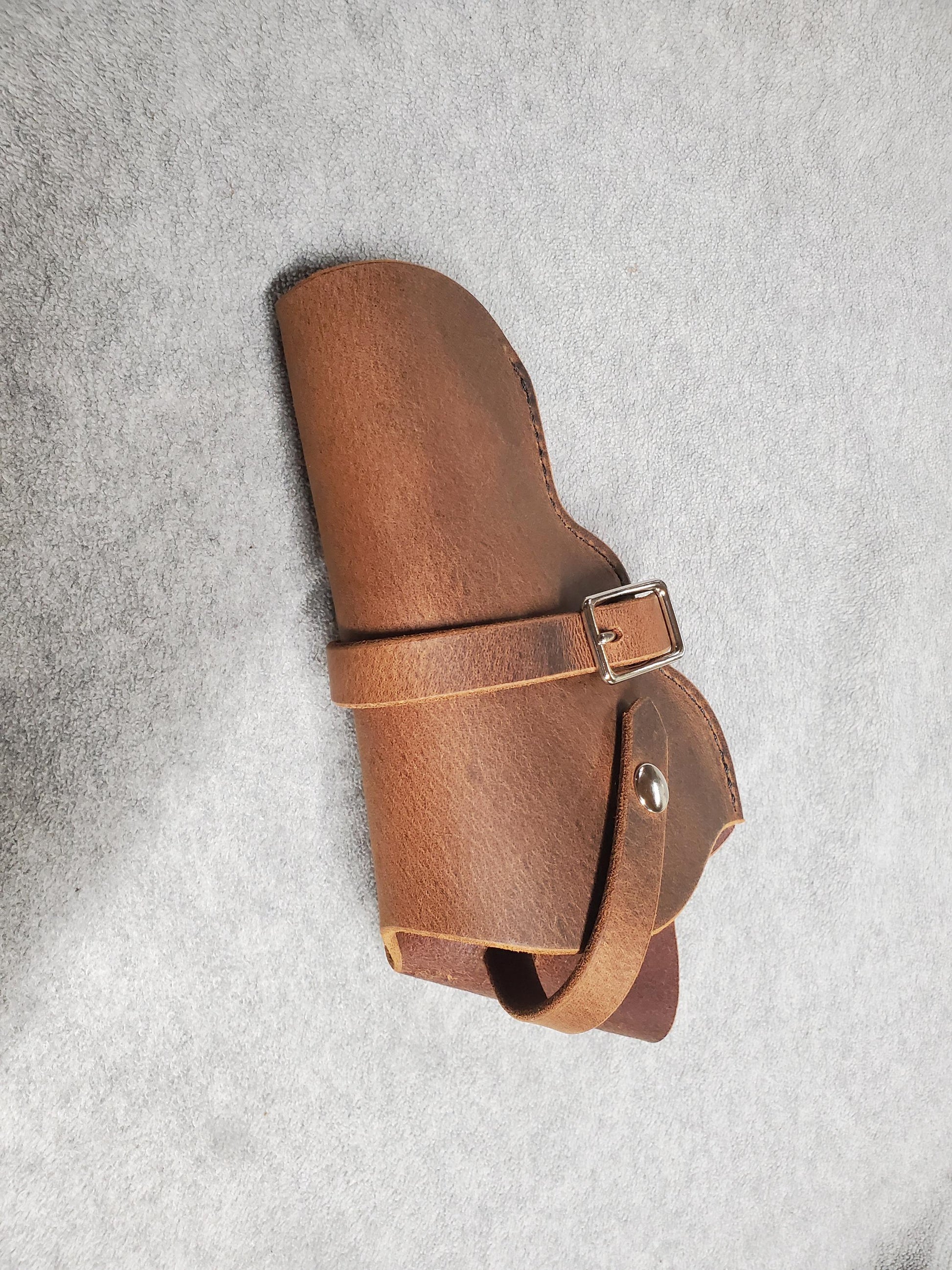 This holster is made from heavy-duty crazy horse leather and has a snap strap and buckle strap around barrel or cylinder.